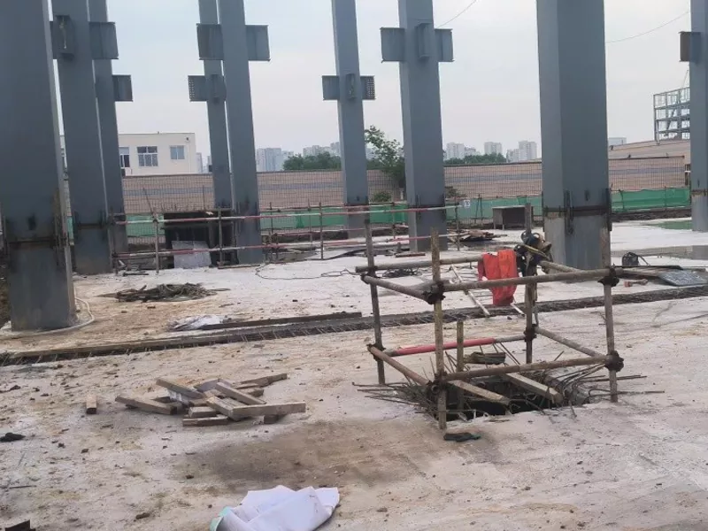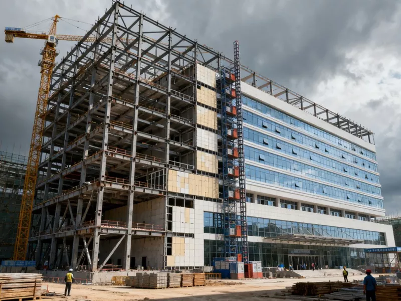 3. Устаноўка на месцы: у той час як кампаненты збіраюцца на заводзе, будаўнічая група папярэдне закапае анкерныя балты на будаўнічай пляцоўцы, каб завяршыць папярэднюю закапку падмурка. Нарэшце вядзецца мантаж вышыннага зборнага металічнага будынка бальніцы.