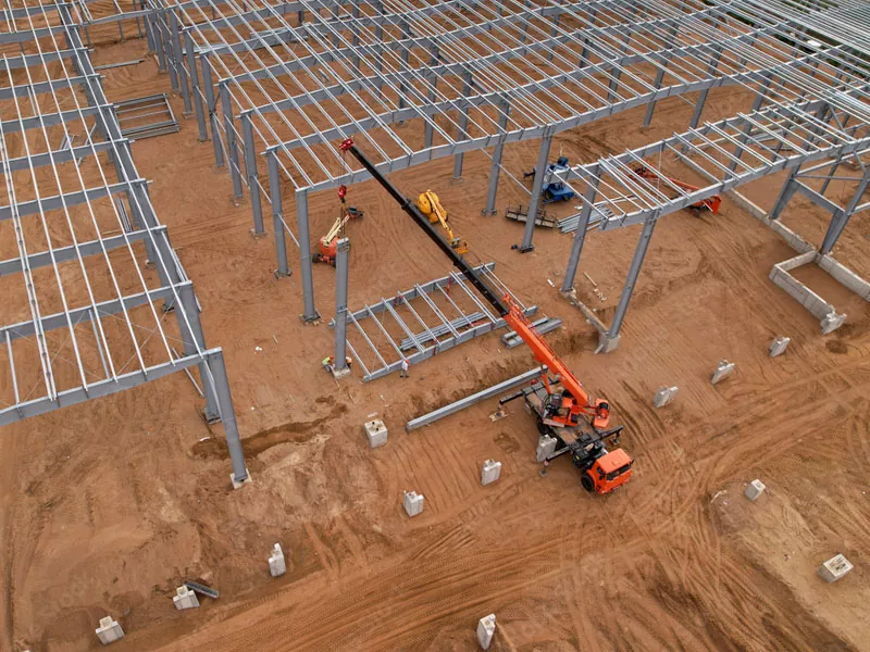 Сталёвыя кампаненты, уключаючы бэлькі, калоны, брекеты і кроквы даху, зборныя ў заводзе. Выкарыстоўваецца якасная сталь, а кампаненты вырабляюцца для дакладных характарыстык, каб пераканацца, што яны дакладна і надзейна ўпісваюцца разам падчас ўстаноўкі. Гэта кантраляванае асяроддзе дазваляе для жорсткіх мер кантролю якасці, забяспечваючы трываласць і надзейнасць кампанентаў.