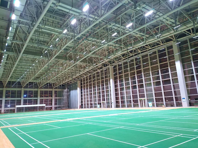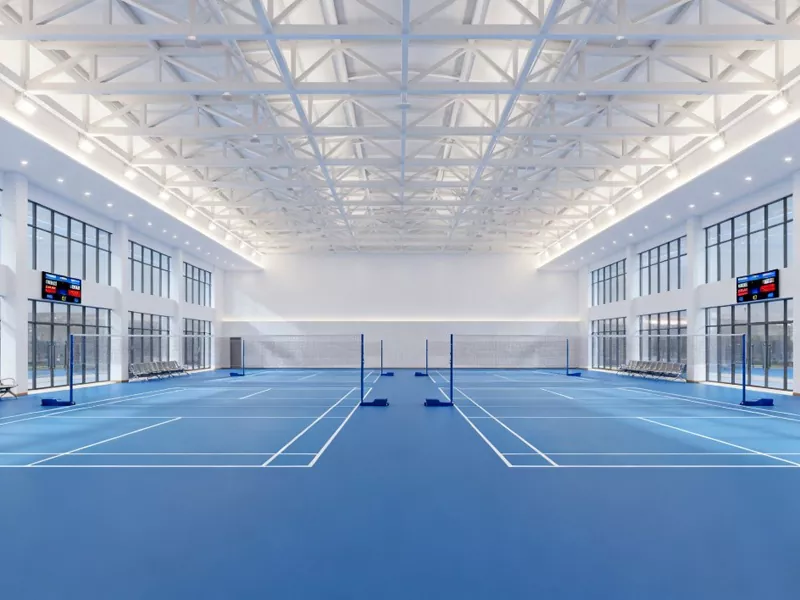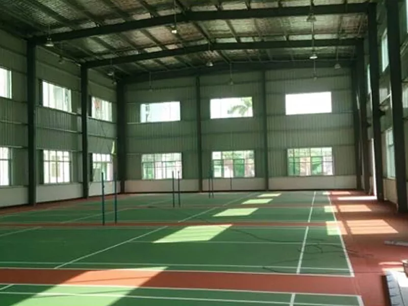 У сувязі з развіццём сучасных спартыўных будынкаў сталёвая канструкцыя бадмінтоннай залы паступова стала пераважнай канструктыўнай формай пры будаўніцтве бадмінтонных пляцовак. Асноўны каркас, які складаецца з сталёвых бэлек і сталёвых калон, улічвае трываласць канструкцыі, эстэтычны эфект і эканамічныя паказчыкі, дэманструючы стандарты прафесійных спартыўных пляцовак. Бадмінтонная зала як закрытая пляцоўка павінна мець добрую сістэму вентыляцыі і цеплаізаляцыйны эфект. У бадмінтоннай зале са сталёвай канструкцыяй можна выкарыстоўваць больш экалагічныя і цеплаізаляцыйныя матэрыялы для сцен, а на даху можна ўсталяваць сонечныя батарэі для выпрацоўкі электраэнергіі для сістэмы вентыляцыі.